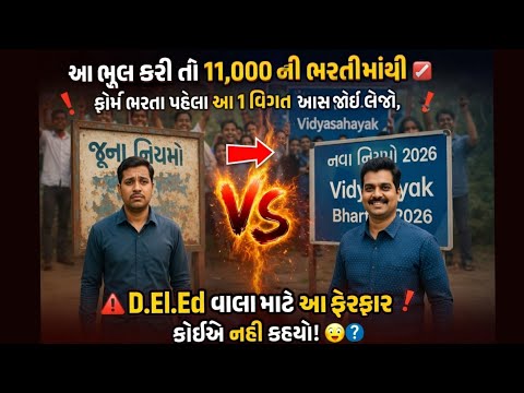 વિદ્યાસહાયક ભરતી 2026: ફોર્મ ભરતા પહેલા આ વિગત નહીં જુઓ તો પસ્તાશો! 😲 11,000 જગ્યાઓ જાહેર પણ આ ઉમેદવારોનું શું? Vidhyasahayak Bharti New Update | D.El.Ed છેલ્લા વર્ષના વિદ્યાર્થીઓ માટે લોટરી! 11,000 ભરતીમાં મોટો ફેરફાર | Education Updates in Gujarati | Yogesh Ravaliya